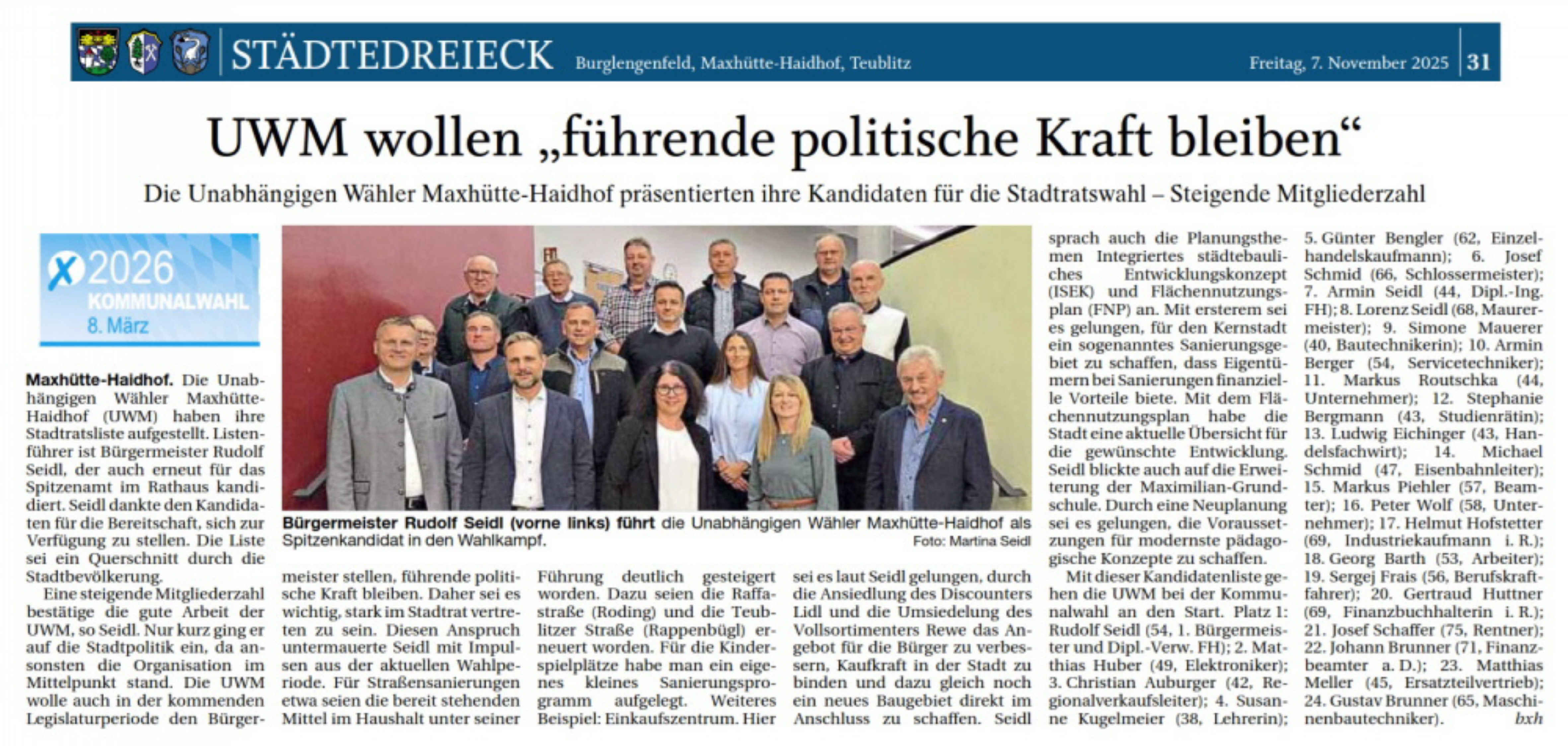 Die Kandidatinnen und Kandidaten treffen sich am 30.10.2025 um 18:30 Uhr zum Fototermin im Foyer der Stadthalle Maxhütte-Haidhof.